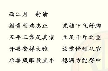 我们先从这首诗开始说起吧。下面这首《西江月》—《射箭》仅用50字就全面阐述了射箭的技术、心理、训练等方面的内容: