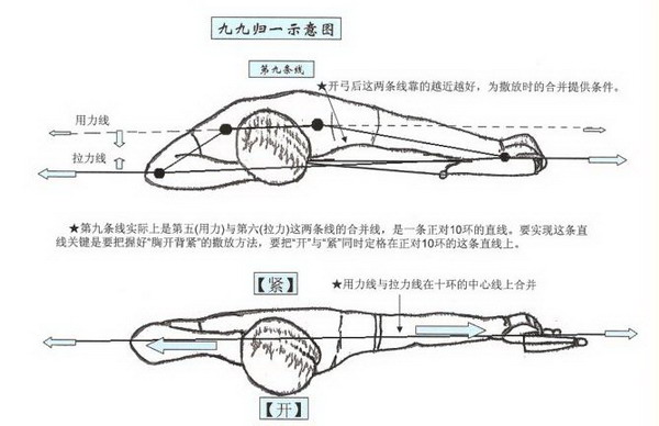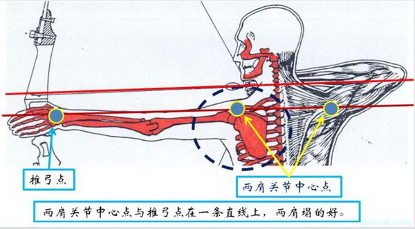 推弓点与钩弦点这对力量相等,方向相反的作用力与反作用力是构成“对称直线用力”的基本条件。因此,推弓的准确与拉弓的准确是十分重要的。