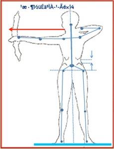 目前很多人基本的“架势”都不错,符合“射贵型端志正”的一些基本要求。射箭要求“五平三靠”,五平,两肩平是基础。两肩平的基本要求是做到两肩要塌下,两肩塌下了,塌实了,其他动作都好做了,练射箭基本功,练塌双肩是基础。参阅下图: